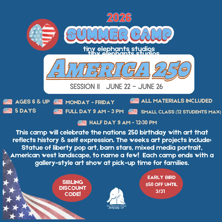Summer Camp session II June 22nd - June 26th Half day: 9:00 am - 12:30 pm Ages Kindergarten & up "America 250" camp Happy 250th birthday America! Let's celebrate through art, symbols, landscapes, and personal identity. Campers work with acrylic paint, mixed media, and photography to create thoughtful, layered artwork that reflects both history and self-expression. Each day we will have time to work on an art piece, break for snack, and be ready for 12:30 for pick up. Half day campers are required to bring a snack & water.